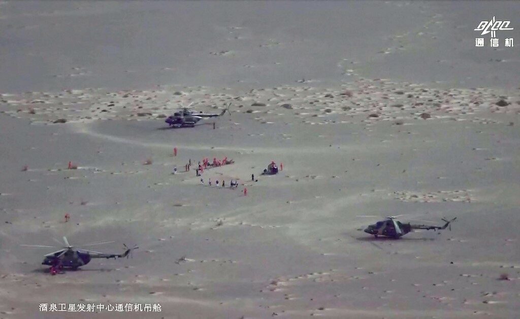A live broadcast of CCTV in China. revealing the image of the capsule landing in the dust and officials cleared the landing area and hurriedly boarded the helicopter to reach the point where the capsule landed.