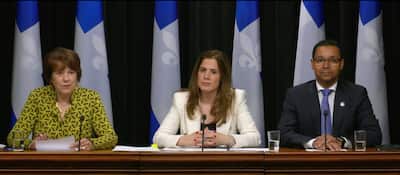 Former minister Hélène David, left, during the presentation of the report on psychology training, June 8, 2023. She was accompanied by the Minister of Higher Education, Pascale Déry, and the minister responsible for Social Services , Lionel Carmant.