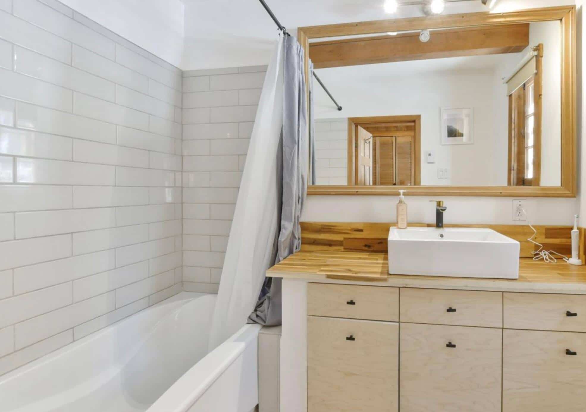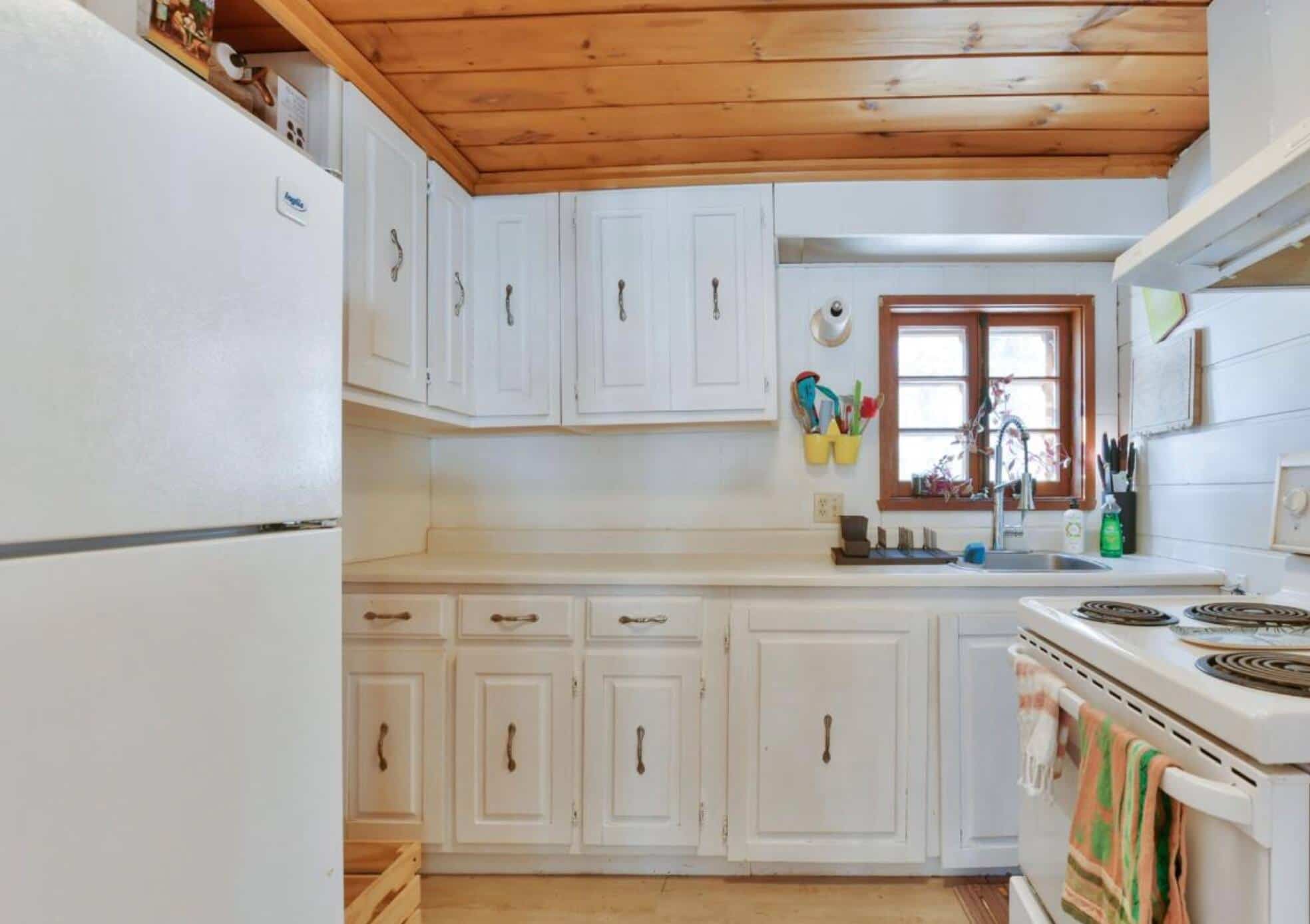 The all-white kitchen, although small, is practical and bright. A beautiful bathroom is on the ground floor.