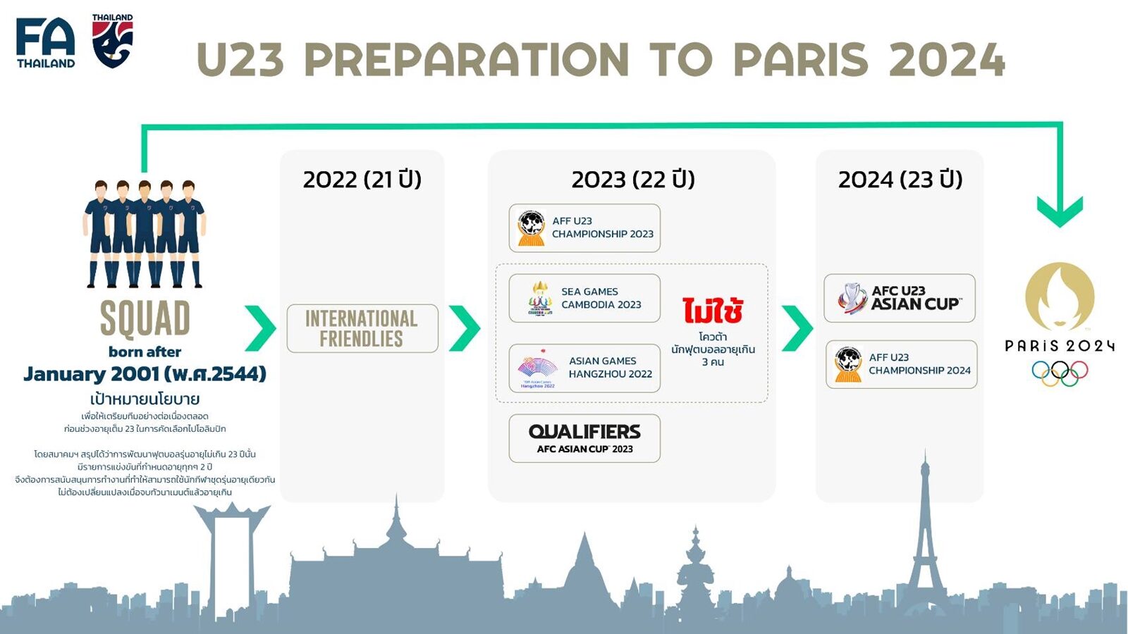 After the meeting, Pol Gen Somyot revealed that we have a plan and want to carry out the planned work. and ready to support the work of the coaching team and youth players to have the most continuity In all U23 tournaments, we will use all players born following January 1, 2001 and will not use over-age players. in the football competition in the SEA Games and Asian Games by asking as a policy and the clear position of the association For the preparation of the Thai national team under-23