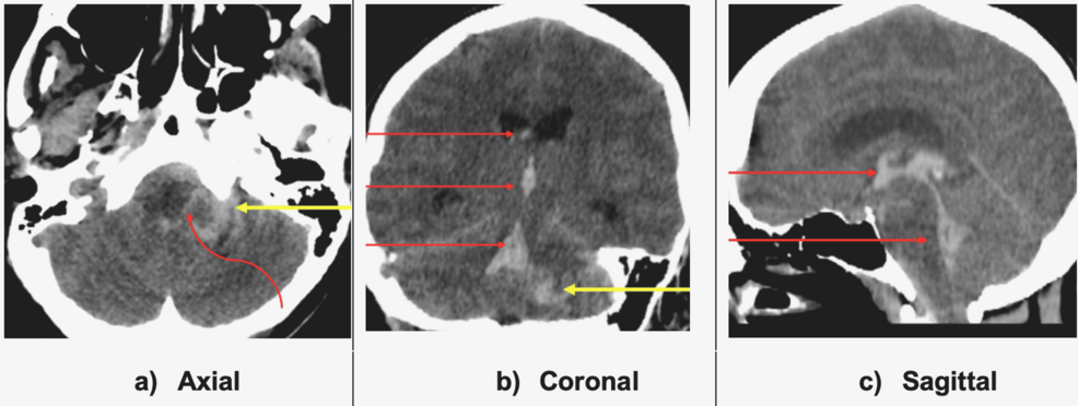 • Symptoms on arrival: Severe occipital headache, nausea, vomiting, and gait instability. The Glasgow Coma Scale (GCS) was 9 (E2 V3 M4).