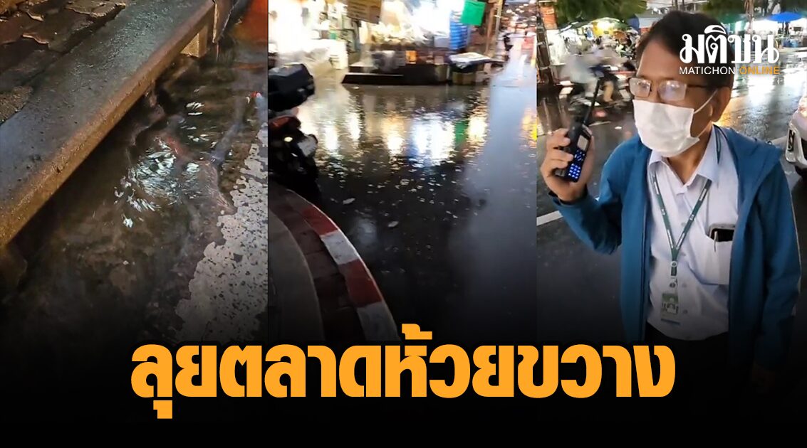 Then, at approximately 6:50 p.m., Mr. Chatchat and Mr. Wisanu Arrive at Huai Khwang Market Pracha Songkhro Road, which 17 minutes ago was flooded with 17 cm of water, but no flooding was found. except at the entrance to the alley a little Villagers share information that this rain, the water recedes quickly. It is believed that it was because of the last stripping of the pipe. Mr. Chatchart then thanked the inmates who peeled the pipes.