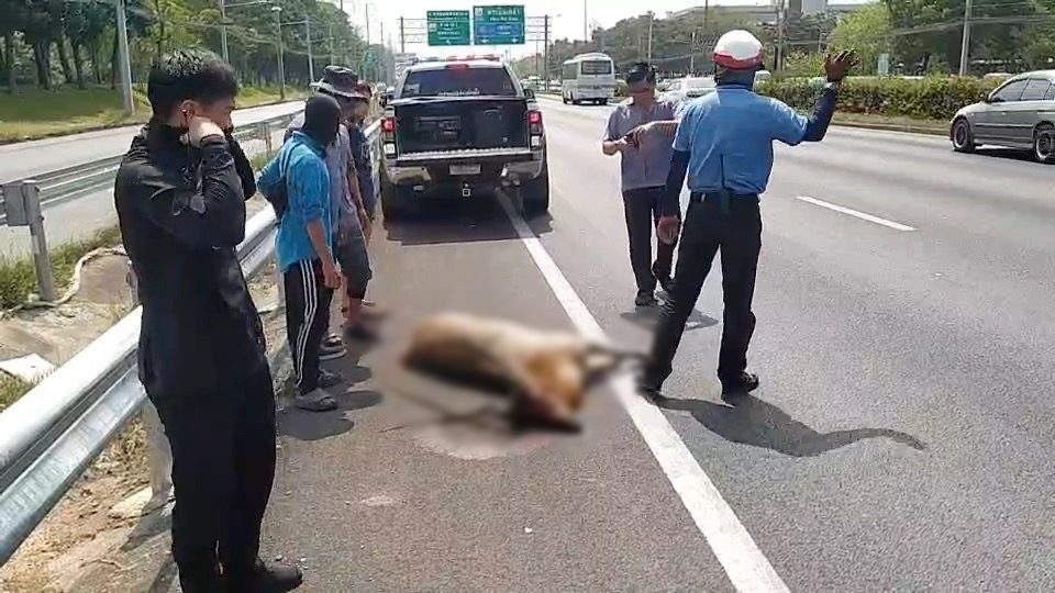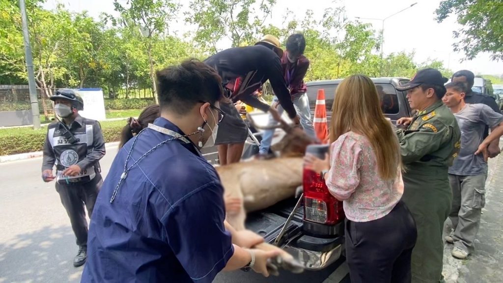On May 1, investigators at Phutthamonthon Police Station, Nakhon Pathom Province received a report from Mr. Voraphot Sae Lim, the driver of a Mercedes-Benz sedan, that he had hit a deer to death while driving down Boromarajonani Road. Inbound to Bangkok at the front Mahidol University Salaya Campus