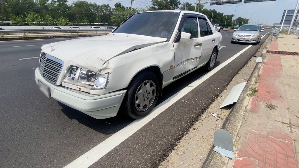 As for the Mercedes Benz sedan, it was damaged by a collision in front of the left side of the car. and the left door. The owner of the damaged Mercedes has contacted the insurance to assess the repair cost.