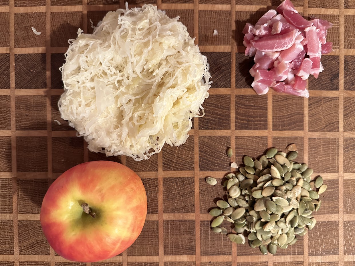 This recipe originated from one of those one kilo jars of new sauerkraut, the presence of a Gala or Natti apple when there are some in the kitchen, bacon bits and of course pumpkin seeds… In the facts, we combine all this…. and here is an entry for two people.