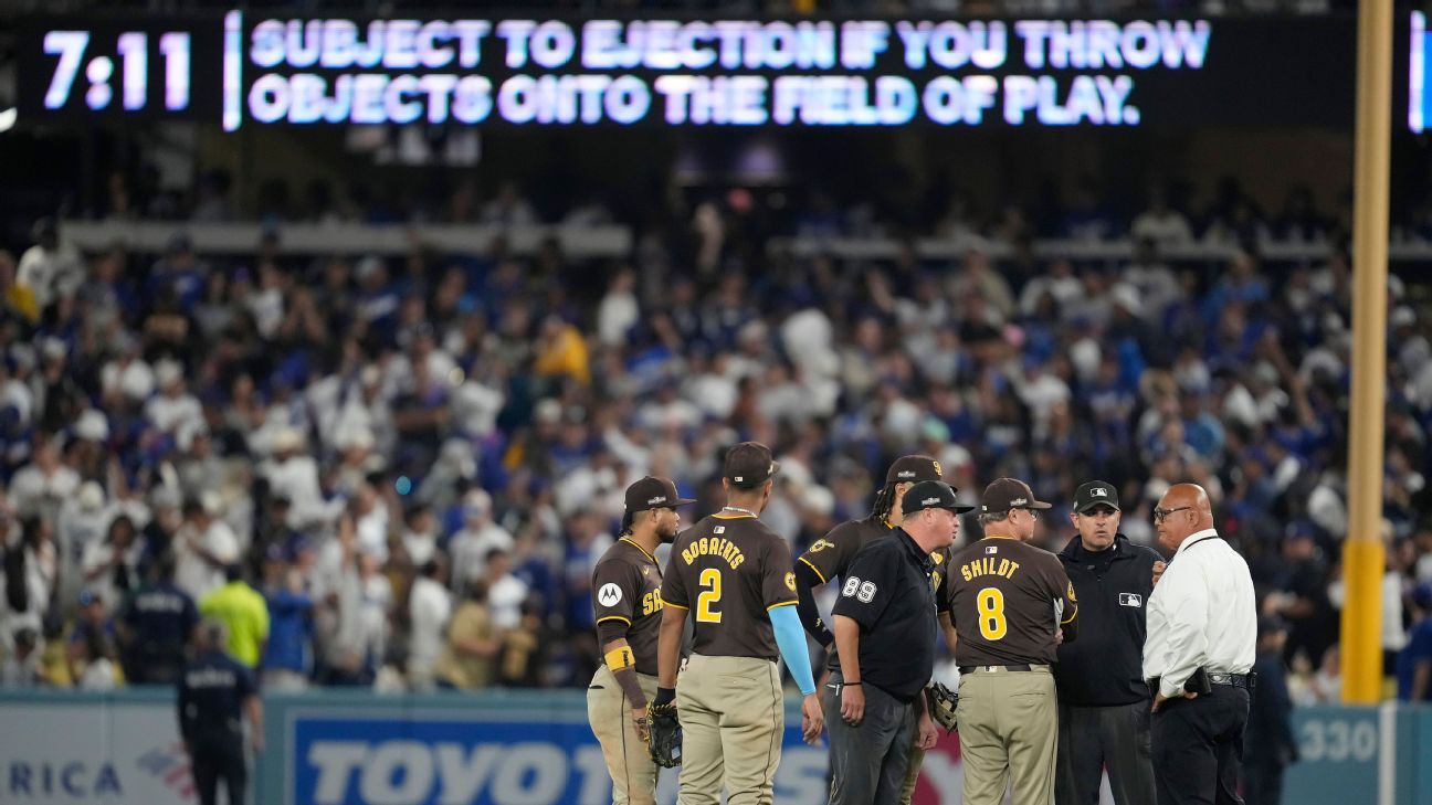 LOS ANGELES — The start of the bottom of the seventh inning Sunday was delayed y About two dozen security guards lined up in the Dodger Stadium foul linesafter the fans will throw objects onto the field in it Game 2 of the SDLNwhich further increased tensions between Los Angeles Dodgers and the San Diego Padresdivision rivals.
