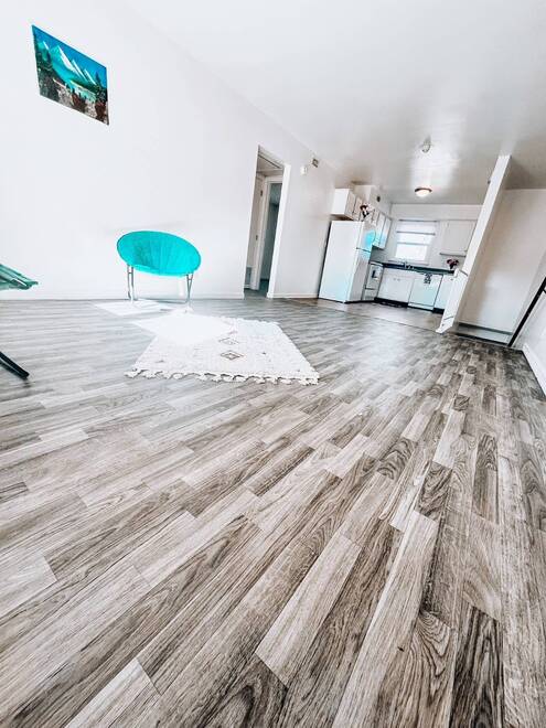 Each apartment features a practical two-bedroom, one-bathroom layout. The kitchens are equipped with ample cabinet and countertop space, perfect for home chefs. Modern LVT flooring extends throughout the living areas and kitchen, offering both durability and ease of cleaning.