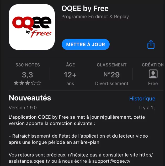Stamped 1.9.0, a new update of the Oqee by Free application is available on iPhone and iPad from iOS 11. All Freebox Pop, Freebox Revolution and Freebox Delta subscribers can benefit from the OQee application on the move on their iOS smartphone.