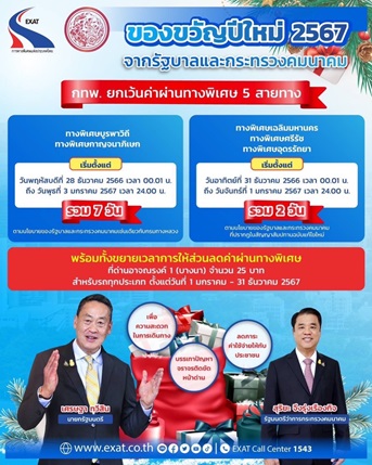 EXAT gives a free New Year gift on 2 expressways (Bang Na-Chonburi and Bang Phli-Suksawat) for a total of 7 days from 28 Dec. 2023 – 3 Jan. 2024, as for the Expressway Stage 1, Stage 2 and Bang Pa-in-Pak Kret. Join hands with BEM to provide free use for 2 days from 31 Dec. 2023 – 1 Jan. 2024 and extend to a 25 baht discount at At Narong 1 checkpoint until the end of 2024.
