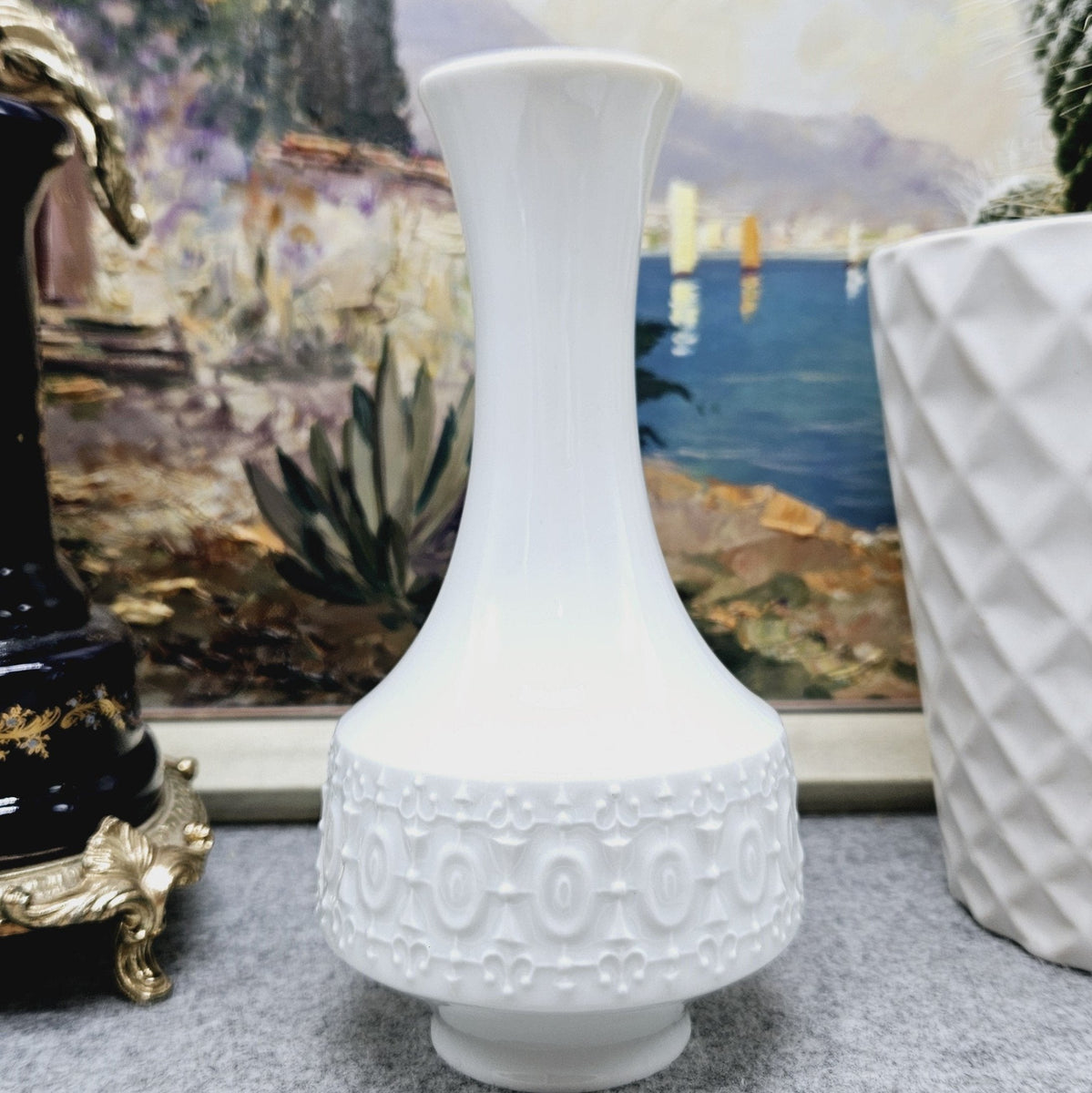 This handcrafted Royal Porcelain Bavaria KPM white porcelain vase is a true work of art that combines craftsmanship and elegance. The vase is characterized by its immaculate white color, which highlights its clean and sophisticated design.
