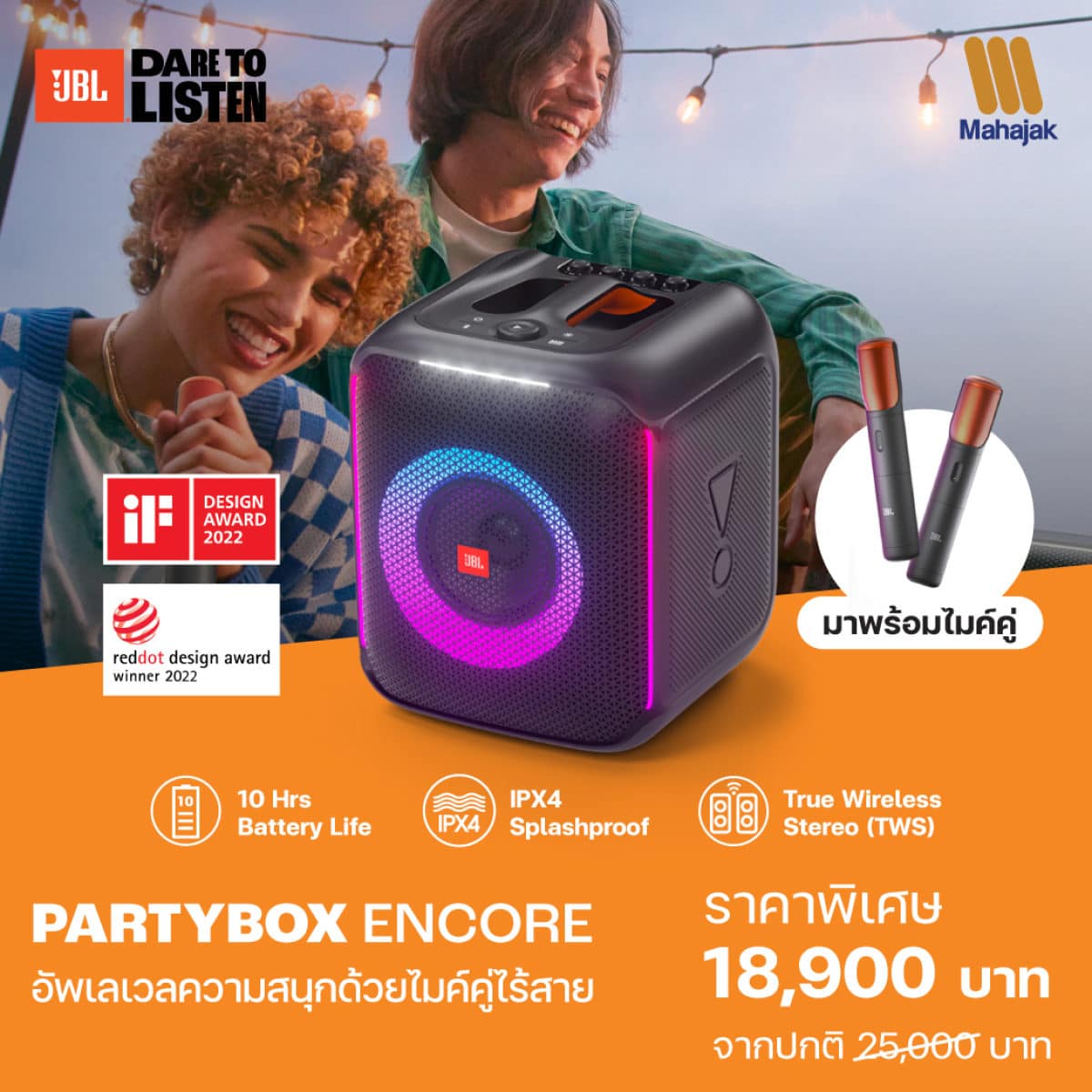 new!! JBL Partybox Encore and JBL Partybox Encore Essential portable wireless party speakers come in a cube-like shape. Designed specifically to be portable. Thanks to the rubber handle, it is very convenient to move. Provides powerful sound like JBL Pro Sound, designed to have IPX4 waterproof rating, so you can enjoy your party at the beach or by the pool without worry. Easily control the speaker’s Lightshow lighting settings or adjust the volume. can adjust the dynamic light color including DJ sound effects And flashing effects, twinkling, club lights synced to the beat of the music via the Application PartyBox, able to connect 2 True Wireless Stereo (TWS) speakers, adding more fun to the party. Suitable for those who are looking for portable wireless party speaker