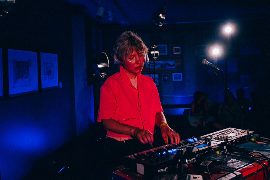 Held within the evocative setting of Le musée d’art contemporain de Baie-Saint-Paul,NV’s performance was an immediate immersion.She gracefully took the stage, wine glass in hand, to a crowd already eager to connect. As a pulsating drum track filled the space, NV moved fluidly between a single microphone and a shimmering synth setup.The gallery walls, adorned with paintings and bathed in soft neon light, provided a unique and fitting backdrop to her ethereal soundscape.