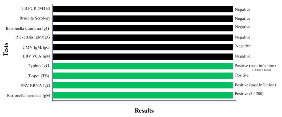 The young patient presented with symptoms consistent with Bartonella henselae, leading to an initial diagnosis. This bacterium typically causes localized infection at the site of a scratch or bite from a cat. However, the patient’s condition did not fully resolve with standard treatment for Bartonella. This prompted healthcare providers to explore option diagnoses.