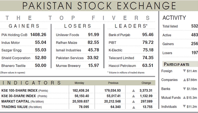 KARACHI — In a session that reinforced confidence among investors, the Pakistan Stock Exchange extended its bullish run, with the benchmark KSE‑100 leaping toward a fresh intraday peak around 184,000 before settling higher at 182,408.24. The close represented a gain of 3,373.31 points, or 1.88%, as traders returned to the market in force on Monday.