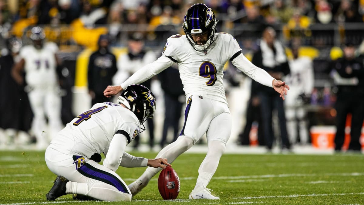 Justin Tucker (#9) stays with the Baltimore Ravens.