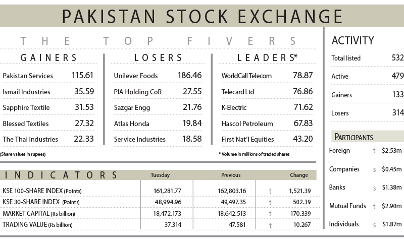 WorldCall Telecom continued to be the most actively traded stock, with 78.8 million shares changing hands. Topline Securities Ltd reported that major blue-chip stocks, including Engro Corporation, Mari Energies, bank Al Habib, MCB bank, and TRG, accounted for a combined 543-point reduction in the index.