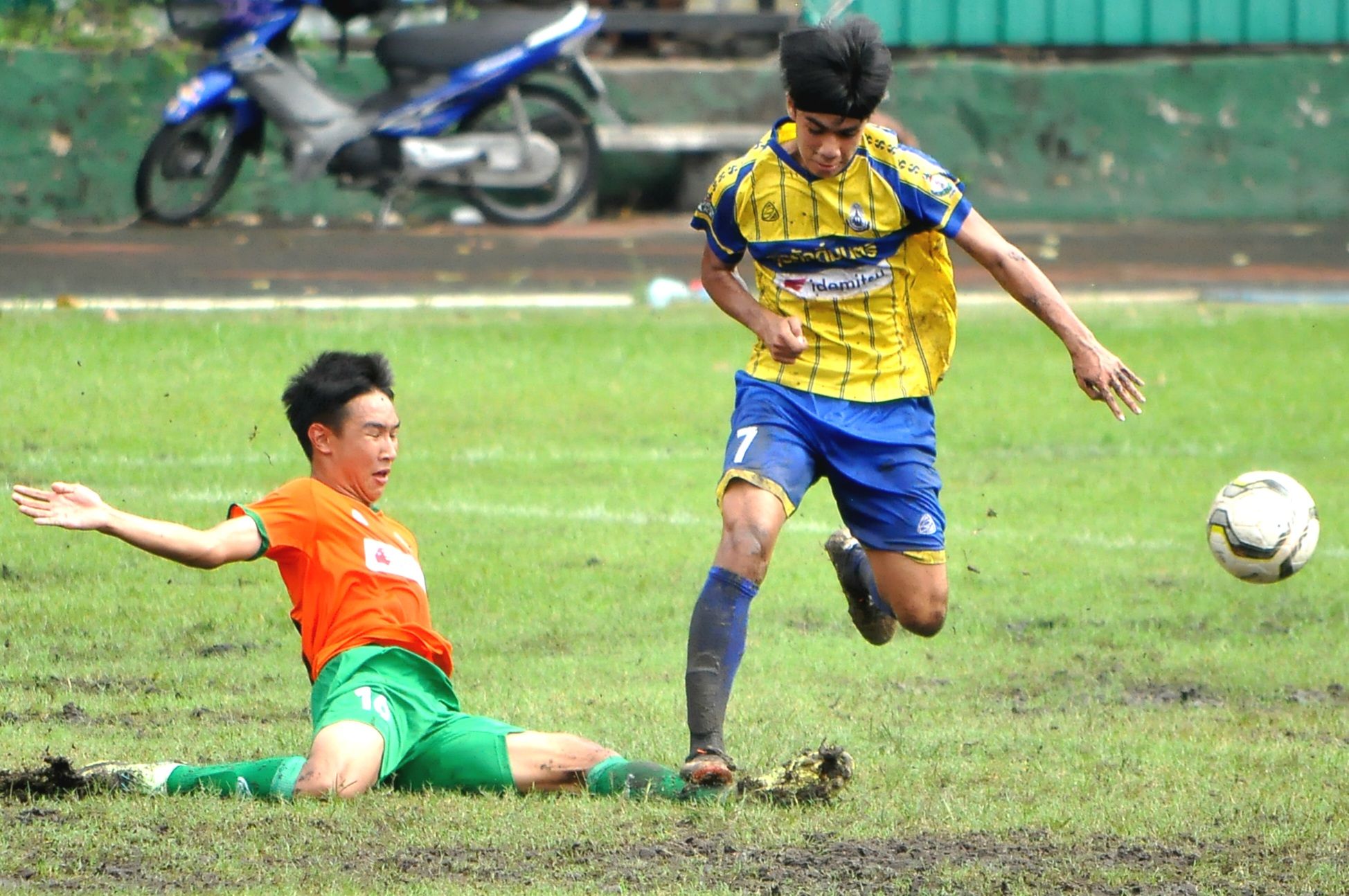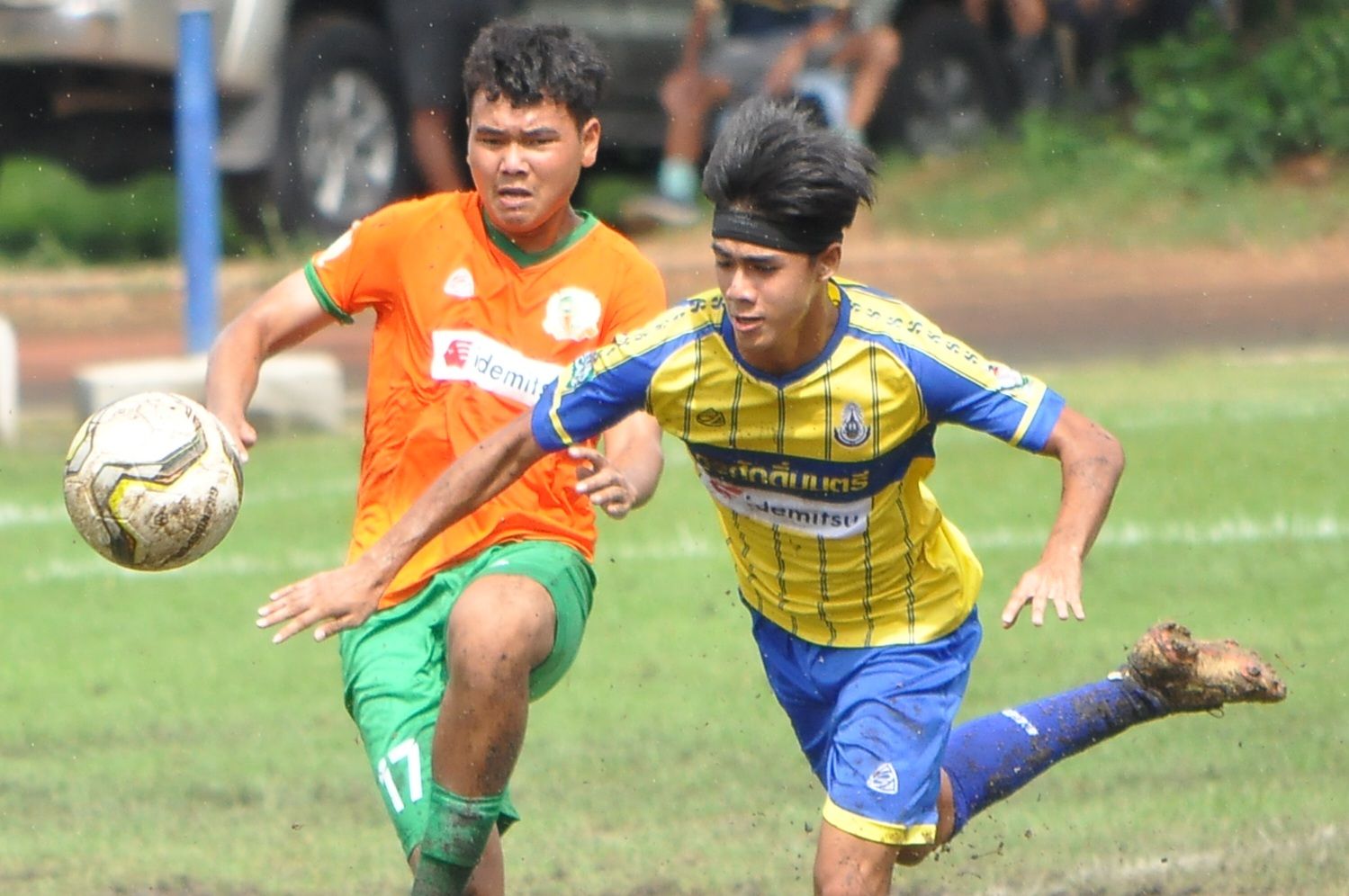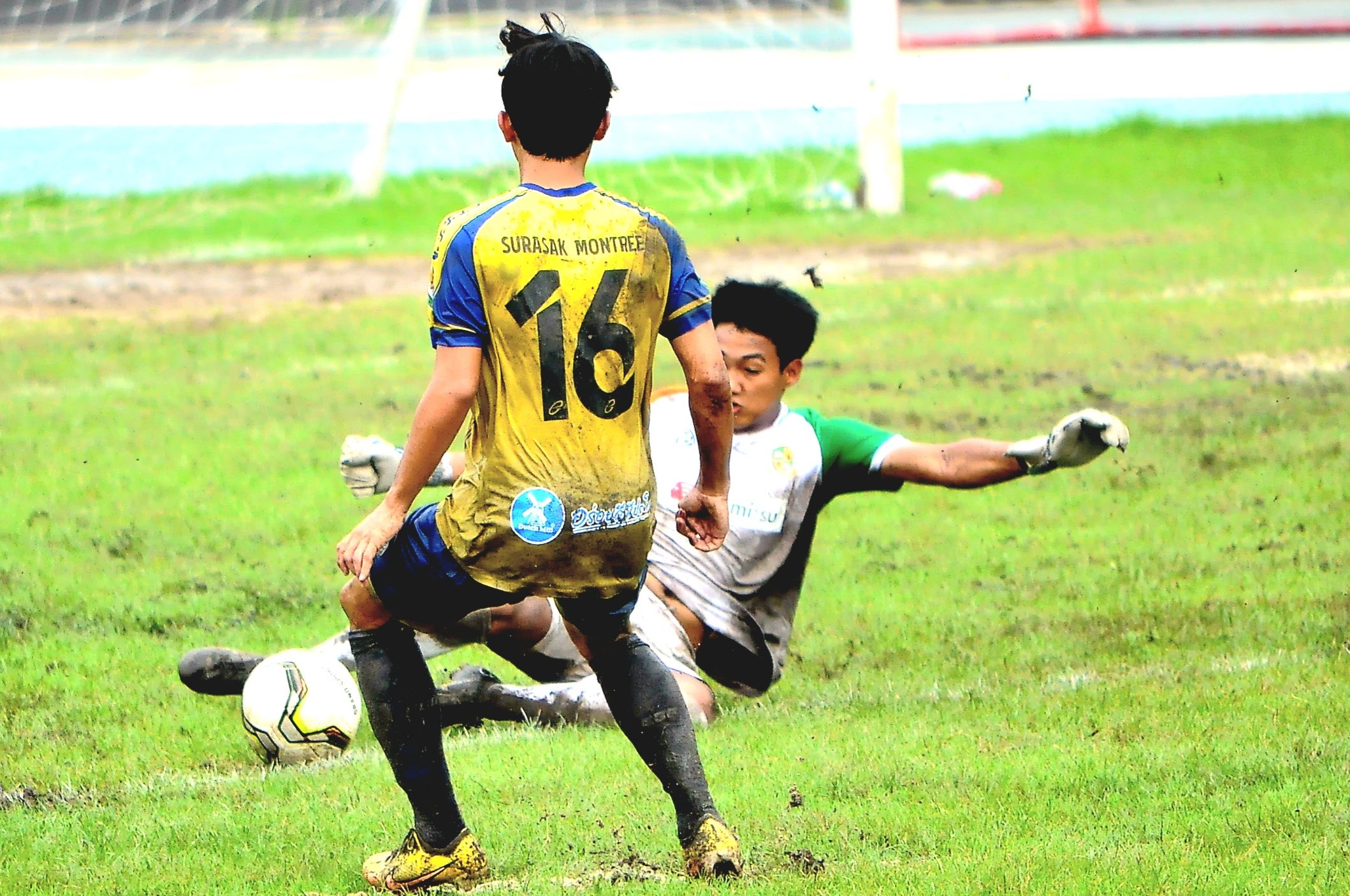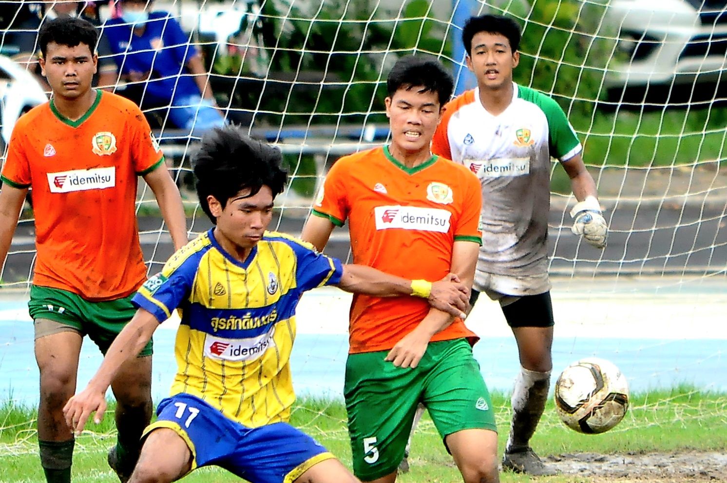 At the field of Rajawinit Bangkaew School … Wat Sutthiwararam School team ranked 5th, met Tha Kham Pittayakom, ranked 4th of Line A. This match, 4 players of the U17 national team of the Tha Kham Pittayakom School team, including Tontawan, Punthamunee, Phachara Phon Lekkul, Jirapong Chamsakul and Thanakrit Lomnak are still with the same team. Kicking each other in the middle of a wet field because before the match the rain had poured down. making it difficult to control the ball