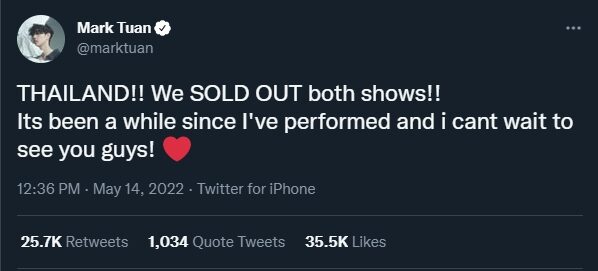 mark He also tweeted to thank all Ahgase or GOT7’s fans, saying, “Thank you for your support. Now the tickets for both rounds of “PULL-UP” MARK TUAN FAN MEETING IN THAILAND have been sold out. Get ready to have fun and have a surprise together.”