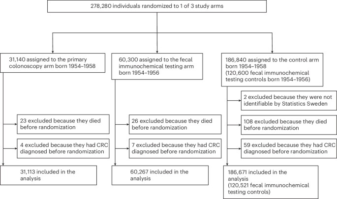 Randomization was conducted using a block method to ensure a fair distribution of participants across the three groups: primary colonoscopy, FIT×2, and usual care. Due to lower-than-expected participation in the primary colonoscopy arm, additional individuals were recruited, bringing the total number of randomized individuals to approximately 278,280. This adjustment aimed to ensure that the study maintained adequate statistical power to detect meaningful differences in mortality rates.