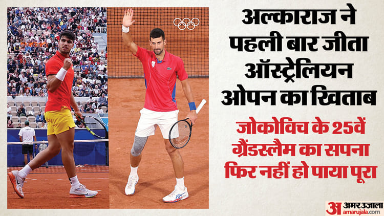 The code snippet represents a portion of a news article page, specifically detailing a tennis match between Novak Djokovic and Carlos Alcaraz in the Australian Open final. it’s designed for the Amar Ujala news website (based on the URLs for images). The snippet includes: