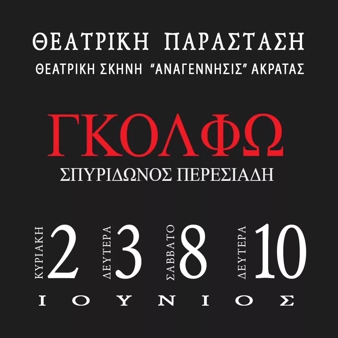 The Cultural Affiliation “Rebirth” of Akrata, as a part of the celebrations for the hundred years since its basis, presents the work “Golfo”, by the blind playwright and poet of our nation Spyridonos Peresiadis.
