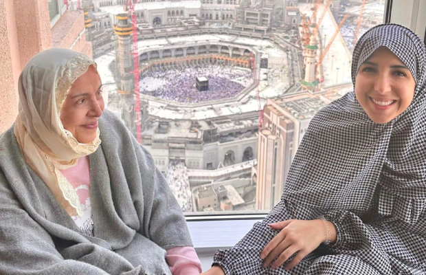 The able artist Afaf Radi published pictures of her from her place of residence in front of the Grand Mosque in Mecca, and the Sacred House and the Kaaba appear in her background, along with her daughter, the young singer Mai Kamal.