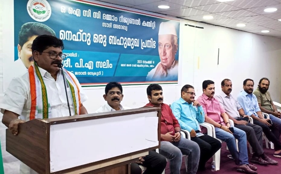 KPCC General Secretary PA Salim said that Pandit Jawaharlal Nehru, the architect of modern India, was a multifaceted genius who left his mark as India’s first Prime Minister, freedom struggle leader, political philosopher, author and historian. He was delivering the keynote address at the Nehru Birthday Celebration Program organized by OICC Dammam Regional Committee as part of Pandit Jawaharlal Nehru’s 134th birthday celebrations.