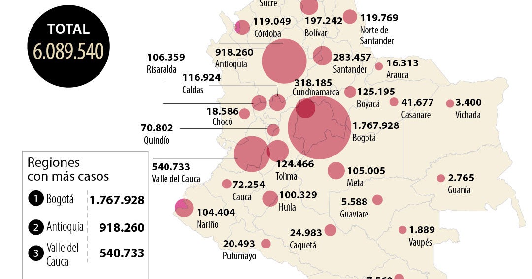 The cities with the highest number of cases are Bogotá with 1.76 million reported cases; Antioquia with 918,260; Valle del Cauca with 540,733 cases in total.