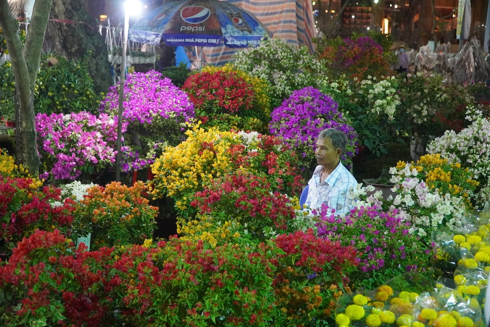 …or a temporary tent is an image easily seen at Tet flower shops.At the Tet flower shop in Park 23/9 (District 1), the clock was regarding to hit the next day, but Mr. Sau (from Ben Tre) might not sleep. Mr. Sau said it was the 5th day he was present in Ho Chi Minh City with more than 100 pots of bougainvillea. Due to the anchorage, he was the only one to go up here, so most of the time he had to stay awake to look following flowers and prevent theft. “This year’s flowers sell very slowly, 5 days but can’t sell 10 pots, like this, it’s not enough money for cars, rice, let alone profit,” Mr. Sau shared.