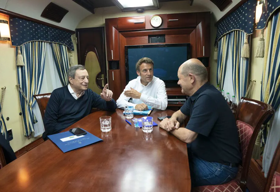 The special envoy of the Ukrainian President Volodomyr Zelenskyj for a prospect of EU membership, Oleksiy Chernyshev, led the four top politicians in Irpin past the ruins of houses that had been damaged by Russian shelling. Scholz, Macron, Draghi and Iohannis want to send a signal of solidarity in Ukraine with the country attacked by Russia.