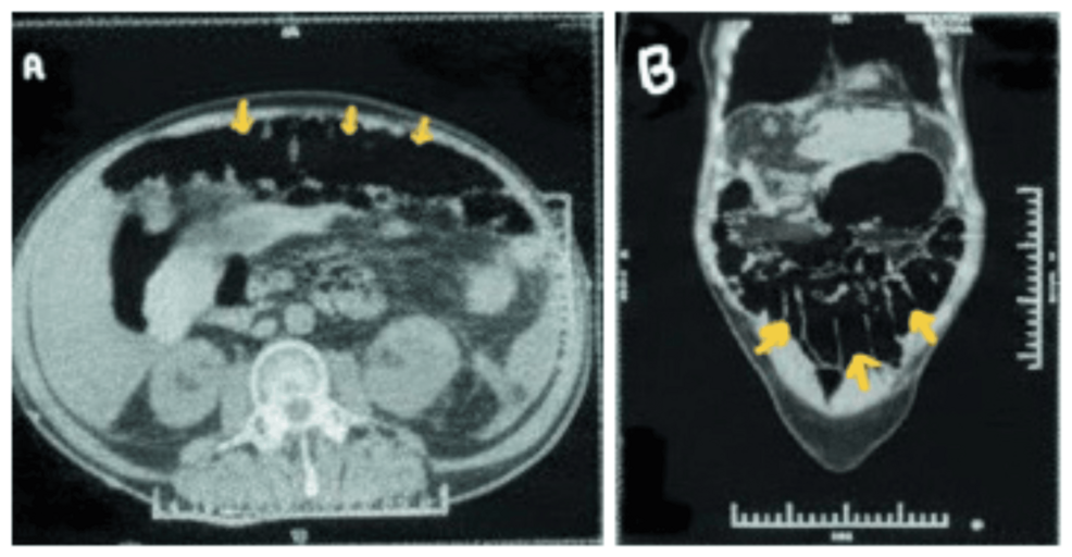 Approximately ten days into hospitalization, the patient developed abdominal distension, nausea, and inability to pass stool or gas. Initial imaging suggested a mechanical bowel obstruction.However, further examination revealed normal bowel caliber on CT scan, with marked colonic dilation – indicative of colonic pseudo-obstruction.