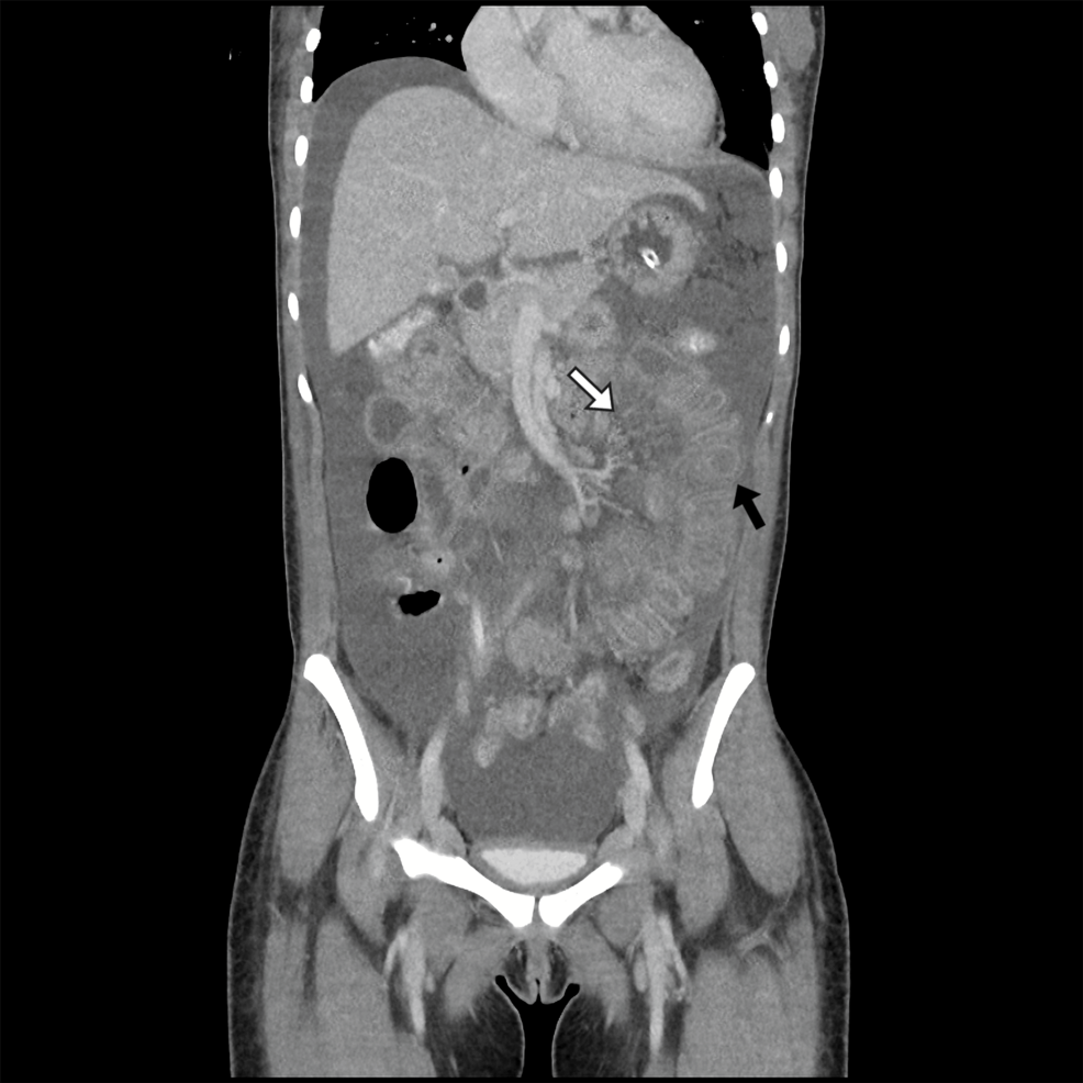 - Mesenteric fat stranding and fluid‑filled peritoneal cavity.