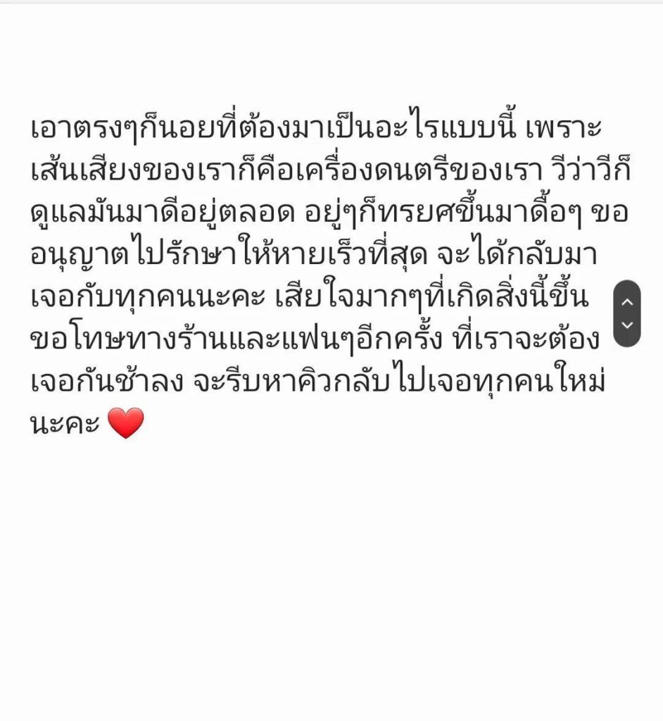 Had to rush out to post an apology, request a fan club urgently for a young singer with a good voice, “V Violet Wautier” when the latest news came out to post informing the news that vocal cord inflammation until he had to rush to the hospital for treatment Which the doctor ordered to take a break from work for 7 days and posted a message of apology to the fans, saying, “I’m very sorry to the people of Lampang, Tak and Phitsanulok. The event on August 15-16-17 must be postponed. I don’t want this to happen at all.