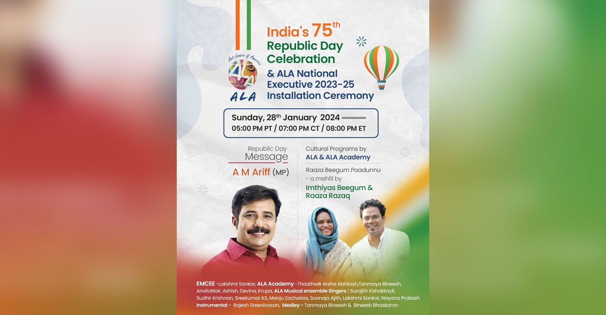 Chicago ∙ The 75th Republic Day celebrations organized by Art Lovers of America (ALA), an American art and culture organization, will be held on a virtual platform on January 28 at 8 pm (New York time). It will also be accompanied by the formal inauguration of Ala’s activities for 2023-25. Attending the function as the chief guest A. M. Arif M. P will deliver the Republic Day message. Artists of Ala and Ala Academy will organize an art party. A musical program ‘Rasa Begum Patunnu’ featuring Imathias Begum and Rasa Razak will add to the mood of the evening.